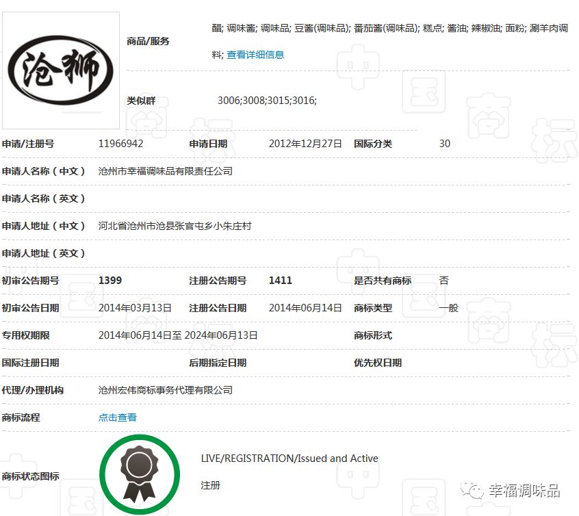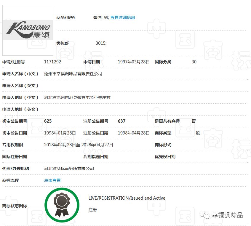幸福調(diào)味品自創(chuàng)辦30多年以來(lái),在工商部門(mén)指導(dǎo)下,充分認(rèn)識(shí)到商標(biāo)品牌的重要性,始終堅(jiān)持走創(chuàng)品牌的路子。公司的“康頌”商標(biāo)于1997年在30類,糖、茶、糕點(diǎn)、調(diào)味品類獲核準(zhǔn)注冊(cè)后,并根據(jù)市場(chǎng)需要,先后又注冊(cè)了包括“滄獅”中文及拼音在內(nèi)的等商標(biāo);形成了涵蓋多類別、多商品、多層次的商標(biāo)品牌庫(kù)。